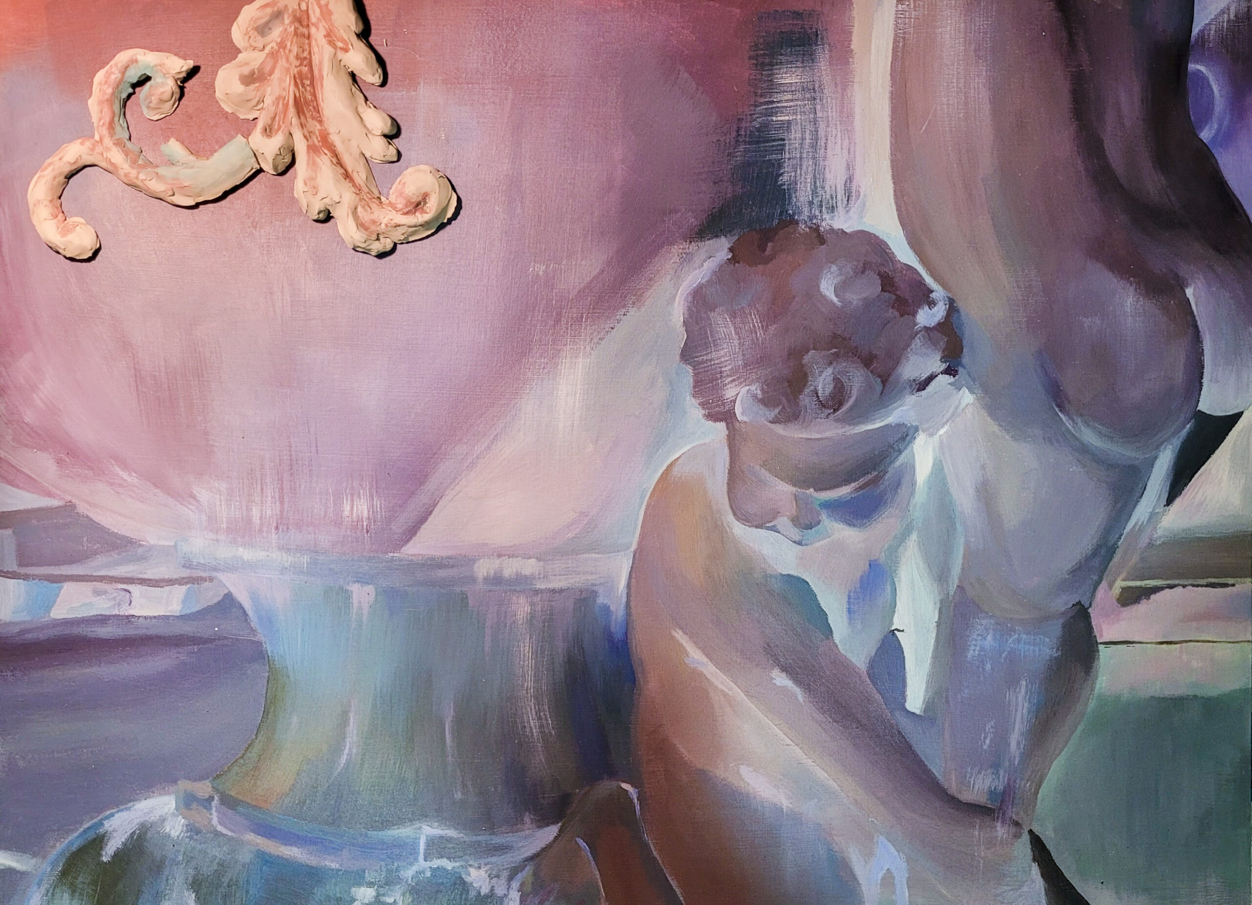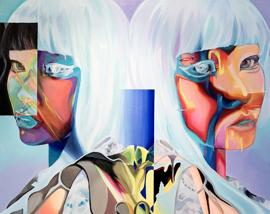 Aquest treball gira entorn de la construcció de la identitat personal i la crisi de la mateixa percepció, especialment influïda per l’ús constant de les pantalles. La pintura parteix d’una fotografia meva, i tot i que podria considerar-se un autoretrat, el tractament que he fet de la imatge s’allunya d’aquesta idea, convertint la figura en un personatge. A la composició apareixen dues versions del mateix rostre, com si fos un reflex, una d’elles es trenca i es desfà com una màscara, mentre que l’altra es distorsiona.