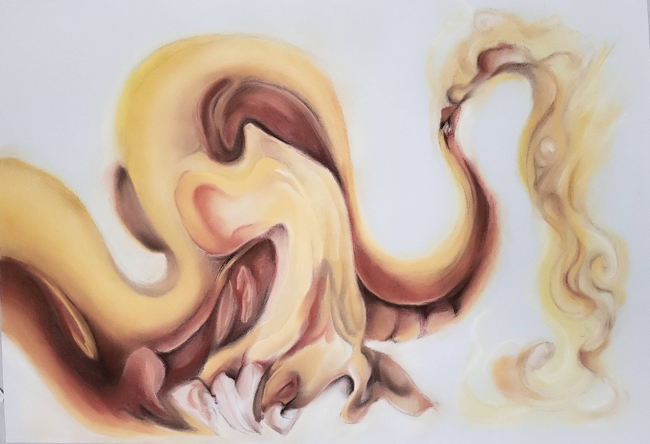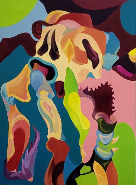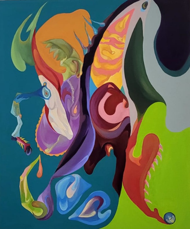 Les dues obres, realitzades amb acrílic sobre llenç, exploren formes orgàniques i colors vius a través d’un llenguatge abstracte i biomòrfic. Cada peça desenvolupa una composició pròpia: una amb una estructura més oberta i dinàmica, i l’altra amb una figura central que agrupa el conjunt. Totes dues dialoguen visualment a través de la riquesa cromàtica i la idea de metamorfosi.