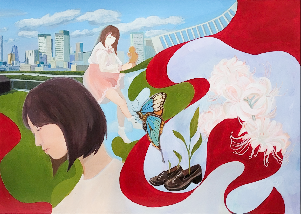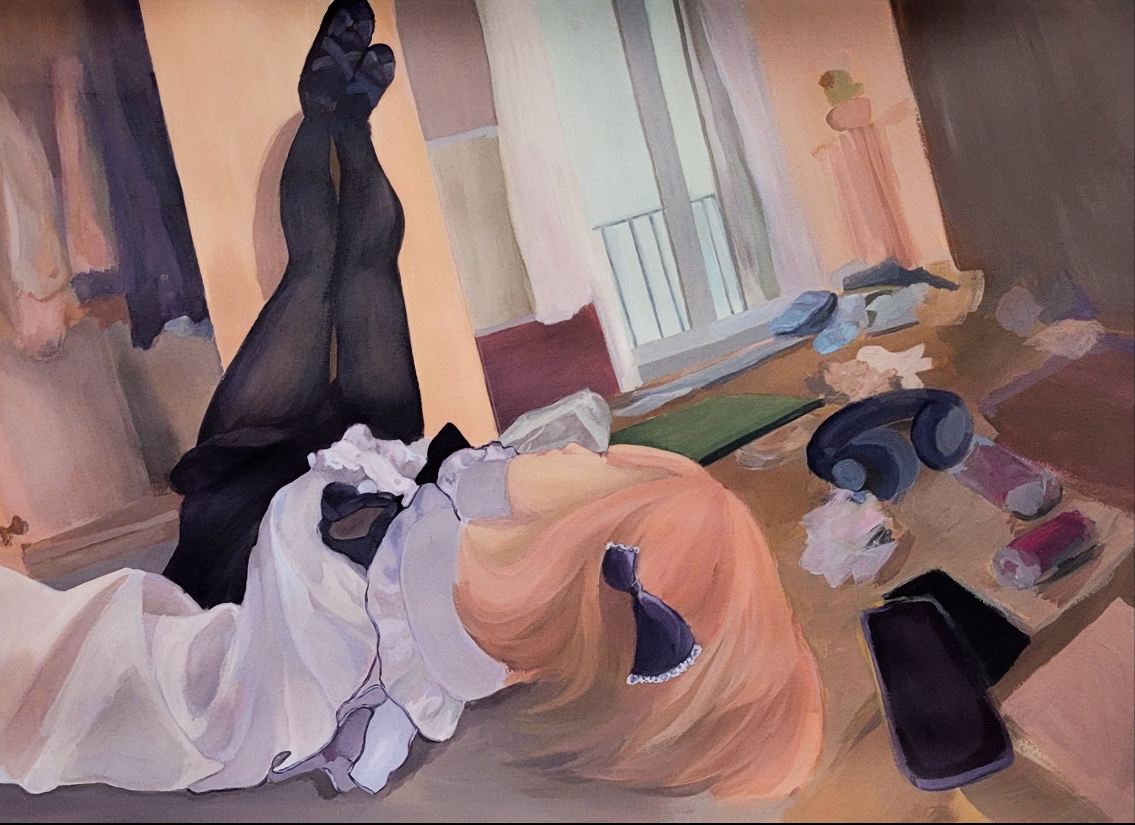 La primera representa un espai íntim, fosc i caòtic, que simbolitza el refugi personal i el desordre mental ocult darrere les aparences. La segona obra, més lluminosa i abstracta, planteja una visió ambigua de llibertat i evasió, incorporant elements simbòlics com la papallona, associada a la metamorfosi, la transició i el món espiritual. Ambdues peces conviden l’espectador a una interpretació oberta, oscil·lant entre la superació i la rendició, i reforçant el concepte de dualisme com a eix central del projecte.